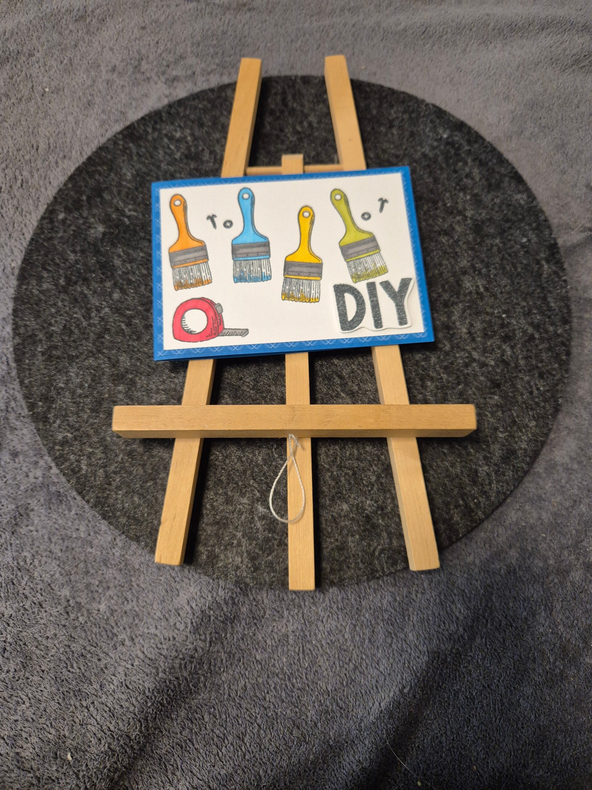 Motiv: Die Karte zeigt Pinsel und ein Maßband. Die Farben sind fröhlich und leuchtend, und das Design versprüht pure Lebensfreude.