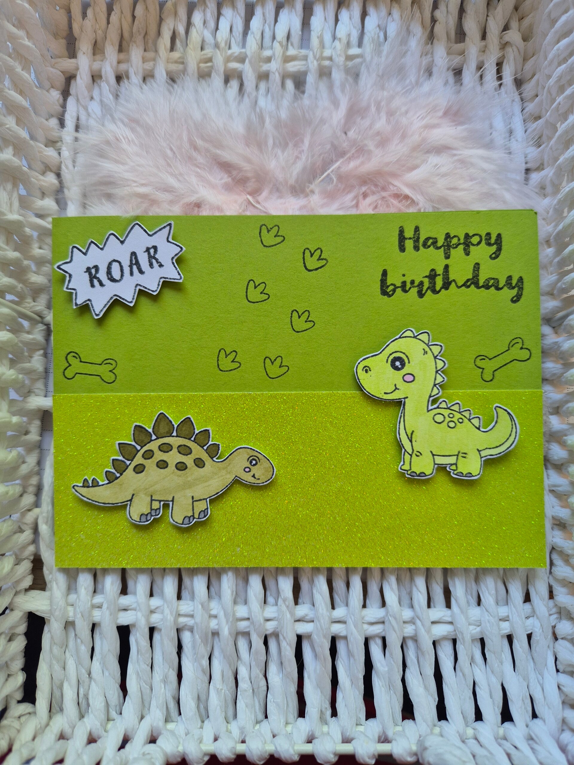 Motiv: Die Karte zeigt Dinos auf der Karte. Die Farben sind fröhlich und leuchtend, und das Design versprüht pure Lebensfreude.