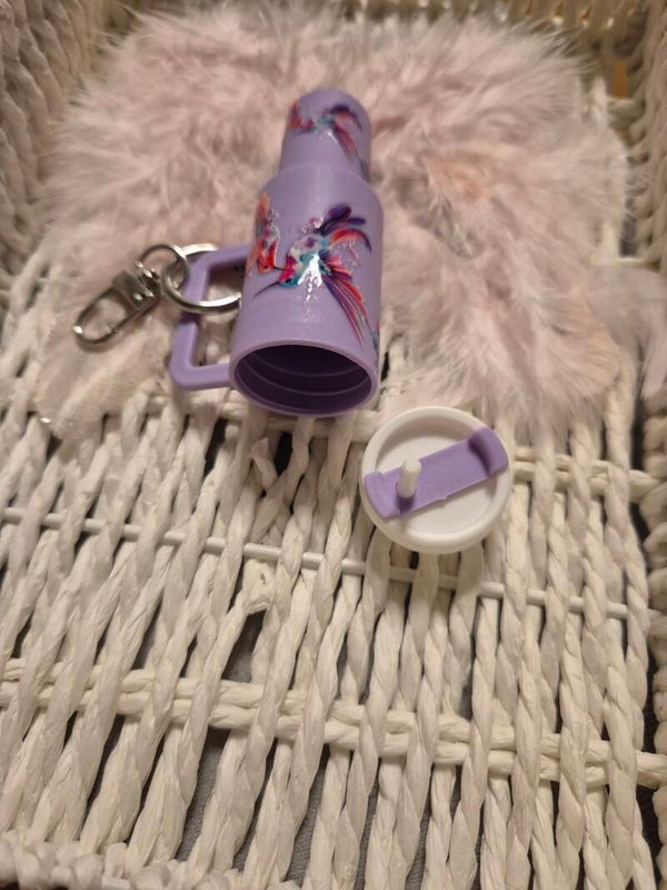 Motiv: Der Tumbler hat einem Kolibri Motiv Sticker drauf und der Anhänger ist helllila.