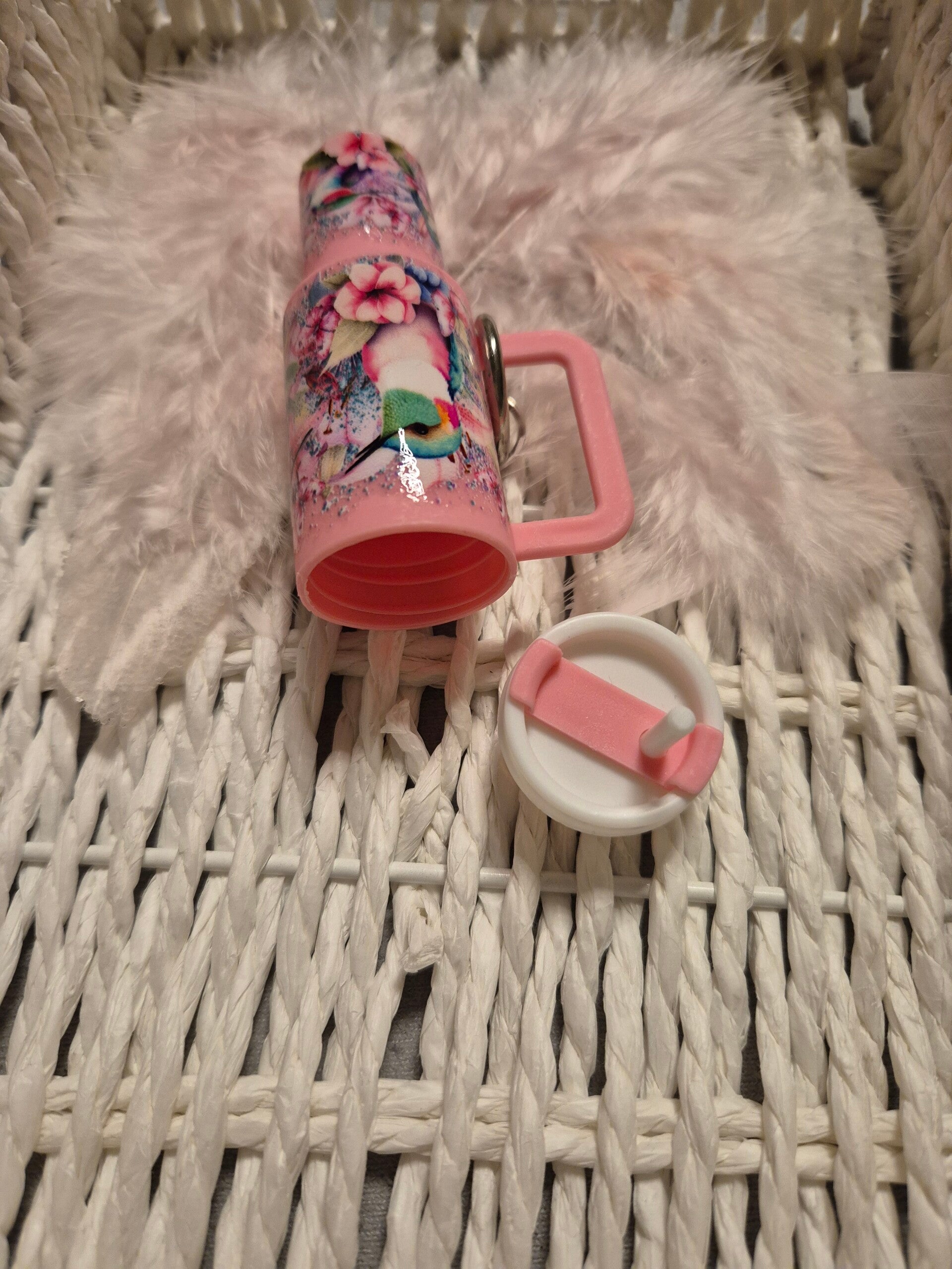 Motiv: Der Tumbler hat einem Kolibri Motiv Sticker drauf und der Anhänger ist rosa